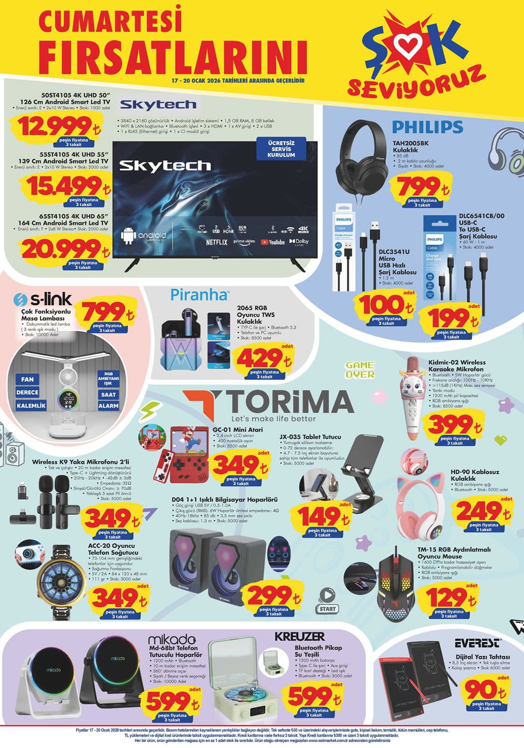 17 Ocak ŞOK Market kampanyasında ilk dikkat çeken aktüel ürün Skytech 65" 4K UHD Android Smart Led Tv oluyor. ŞOK 17 Ocak 2026 kataloğunda Skytech 65" 4K UHD Android Smart Led Tv için 20.999 TL fiyat karşımıza çıkıyor. ŞOK 17 Ocak 2026 aktüel kataloğu ile bu hafta sonu gelecek diğer aktüel ürünlere de hızlıca göz atalım.