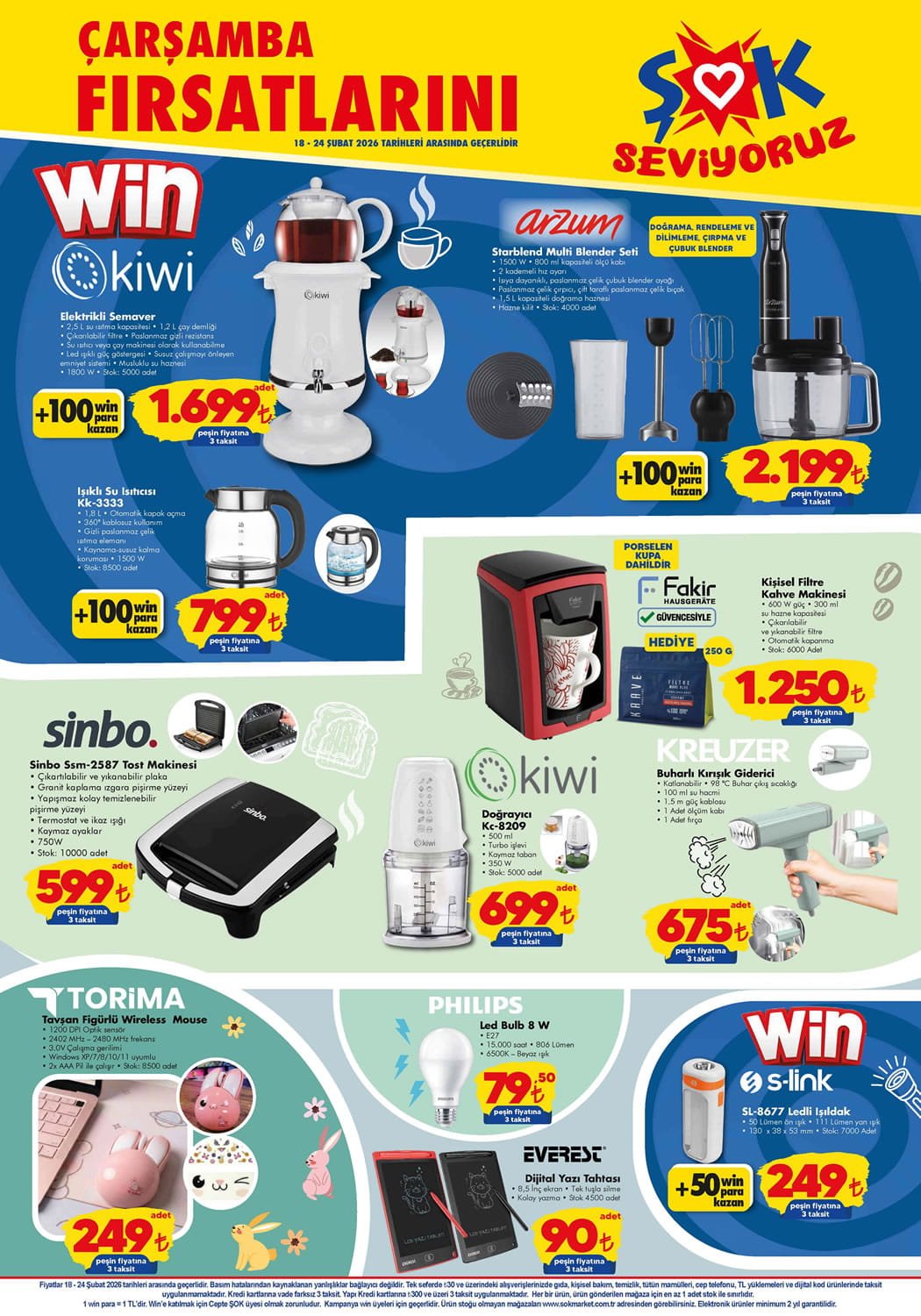 ŞOK Market 18 Şubat kampanyasında Sinbo Tost Makinesi, Kiwi Elektrikli Semaver, Kumsal Tava ve Fakir Kişisel Filtre Kahve Makinesi haftanın dikkat çeken aktüel ürünleri arasında yer alıyor. ŞOK 18 Şubat 2026 Aktüel Ürünler Kataloğu ile bu hafta satışa sunulacak tüm ürünlere sayfamızın devamından ulaşabilirsiniz.