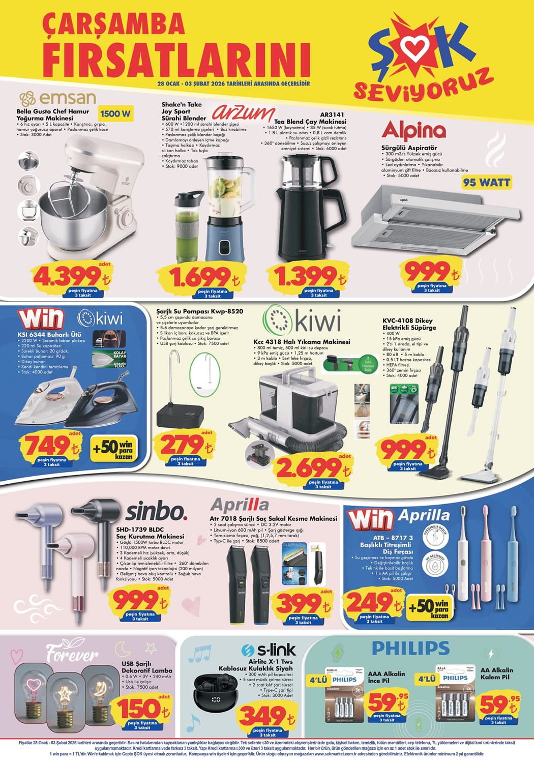 ŞOK Aktüel 28 Ocak kampanyasında Kiwi Halı Yıkama Makinesi, Arzum Tea Blend Çay Makinesi, Sinbo Saç Kurutma Makinesi ve Macromax Otomatik Temizlik Seti haftanın öne çıkan aktüel ürünleri arasında yer alıyor. ŞOK 28 Ocak 2026 Aktüel Ürünler Kataloğu ile bu hafta satışa sunulacak tüm ürünlere sayfamızın devamından ulaşabilirsiniz.
