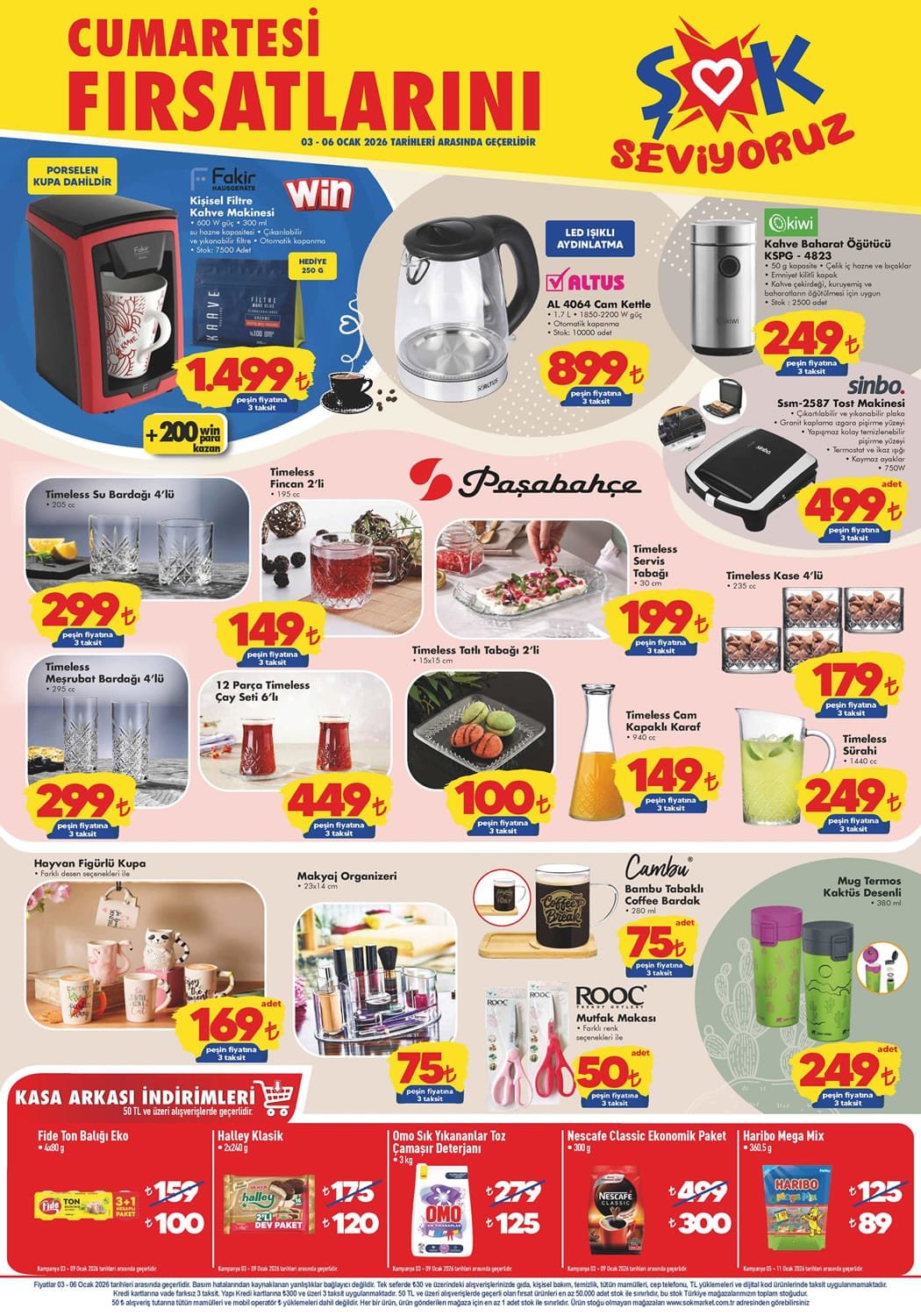 ŞOK Aktüel 3 Ocak kataloğunda Altus Cam Kettle, Çift Kişilik Çift Taraflı Yorgan, Sinbo Tost Makinesi ve Dinarsu Wellsoft Tv Battaniyesi haftanın dikkat çeken aktüel ürünleri arasında yer alıyor. ŞOK 3 Ocak 2026 Aktüel Ürünler Kataloğu ile bu hafta sonu gelecek tüm ürünlere sayfamızın devamından ulaşabilirsiniz.